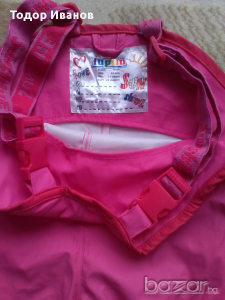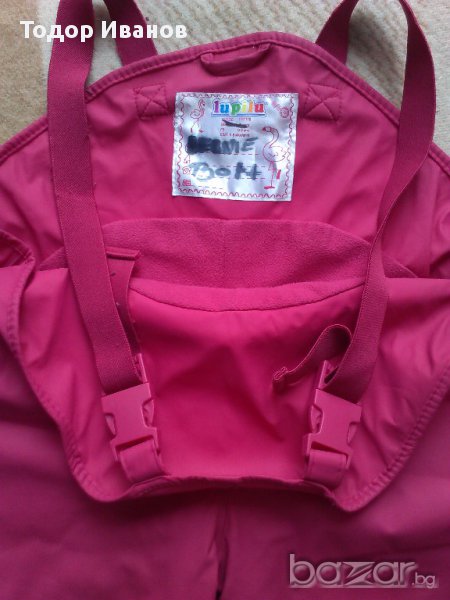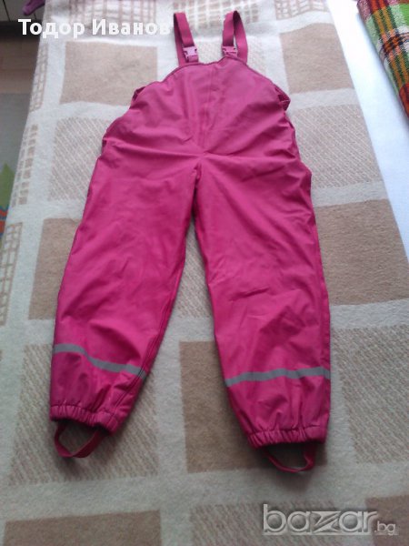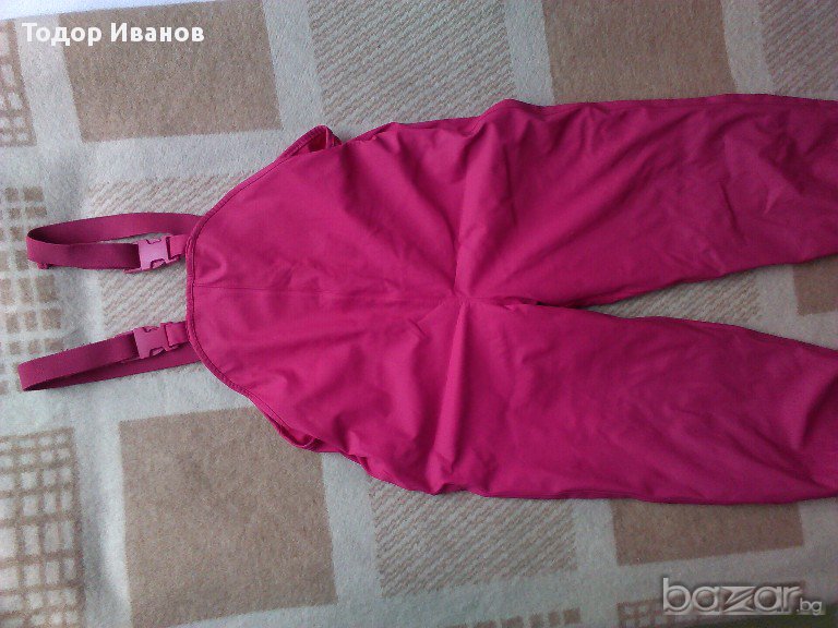 Два броя противовлажни гащиризони, подходящи за сняг, с копчета за стесняване на талията: 2-4 годинки, 98/104, розов; 6-8 годинки, 122/128, червен, с подплата. Цената е за един брой. Тел. 02/82 92 007.