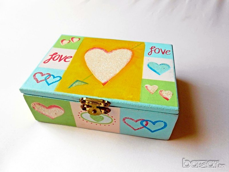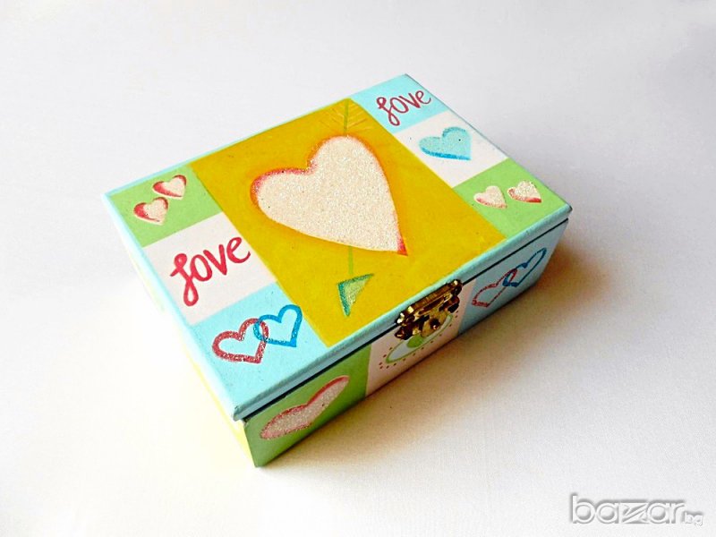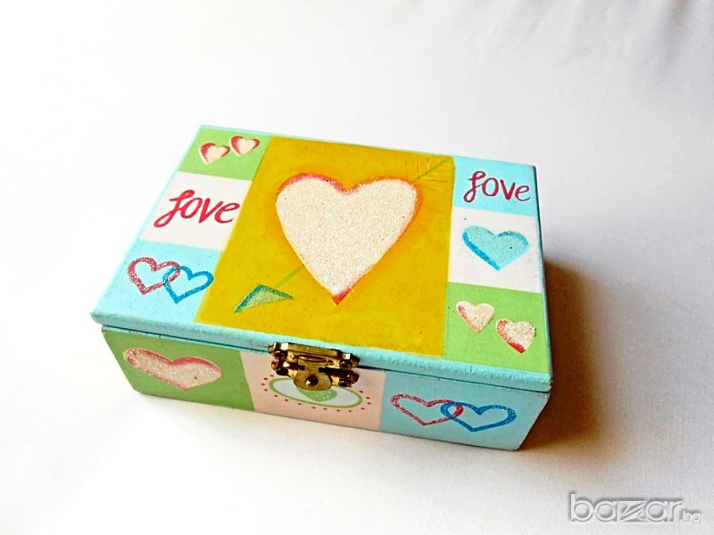 Ръчно изработена кутия за бижута в ярки цветове, декорирана със сърца. Прекрасен подарък за любимата жена.
