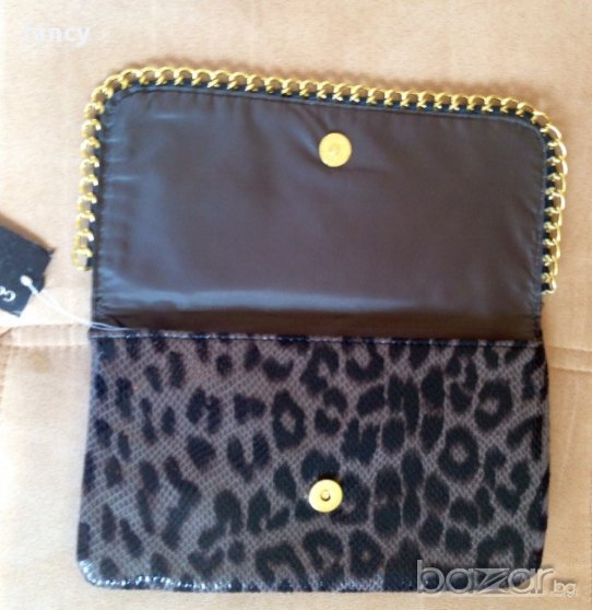 Дамски клъч в животински принт. Чисто нов, с етикет. Обточен със златна метална верига. Закопчаване с магнитно копче. Вътрешен джоб с цип + малко джобче. Сива подплата. Размери - широчина - 25см,