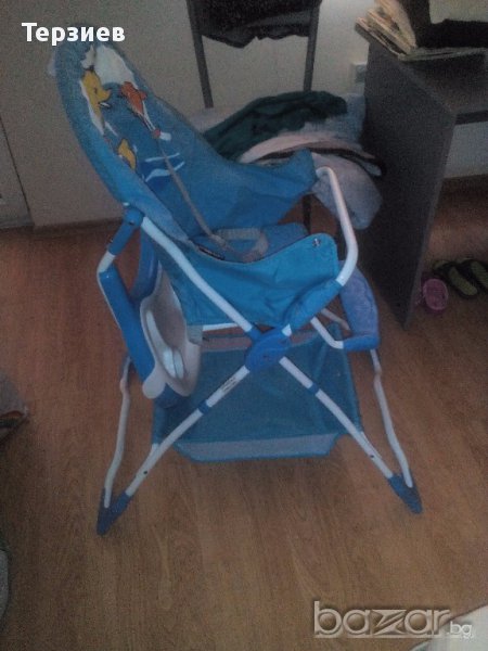 Детско столче за хранене, синьо с повдигаща се табла и долно етажче, без забележки.