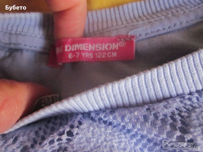 Блузката е страхотна, макар, че по етикет е за 7-8 год., дъщеря ми я носи на 5. Размери - дължина 37 см., ширина под мишниците 35 см., дължина на ръкава от яката - понеже е реглан - 45 см.