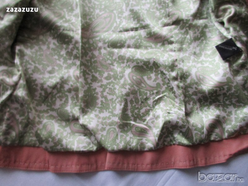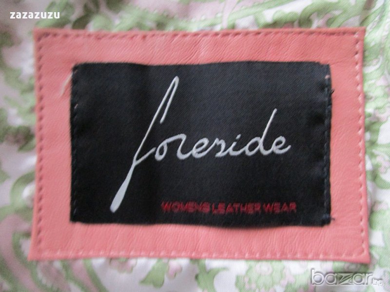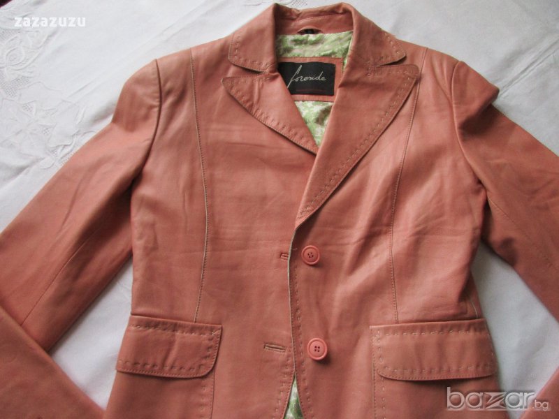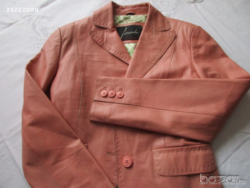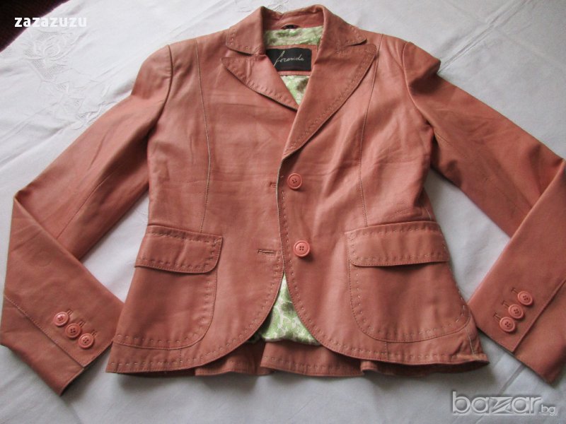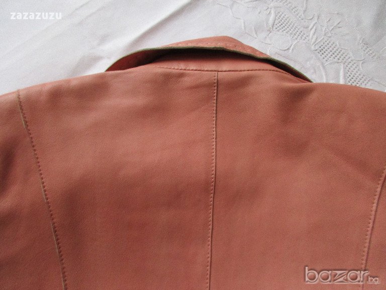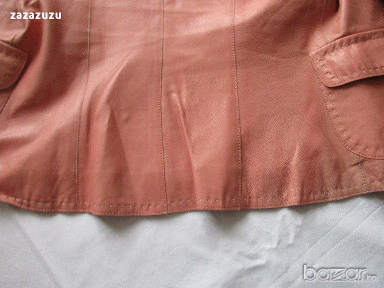 Дамско кожено сако, цвят млечно розов, кожата е естествена агнешка напа, много мека, дрехата е без забележки. Размер по етикет-36, а в сантиметри е както следва - гръб от рамо до рамо42см., ръкав от рамото до долу-63см., дължина от тила до долу-60см., гръдна обиколка-94см., талия-80см., обиколка най-долу-98см.