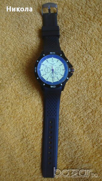 Нов часовник.Работи с батерия.Корпусът от метал,каишката силикон.Стъклото е минерално.Работи идеално.