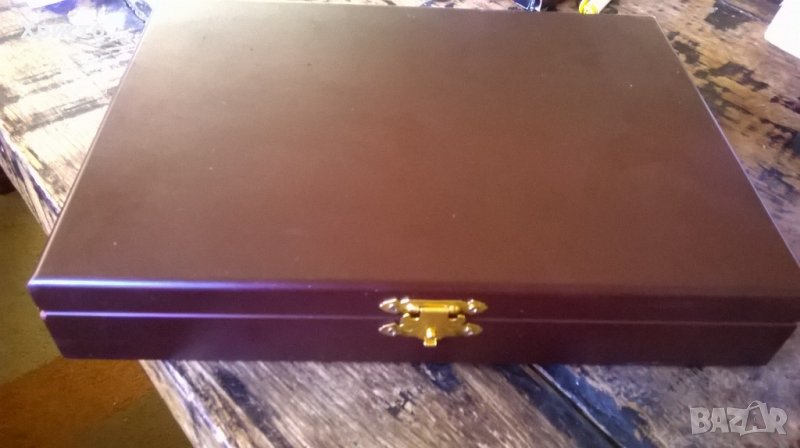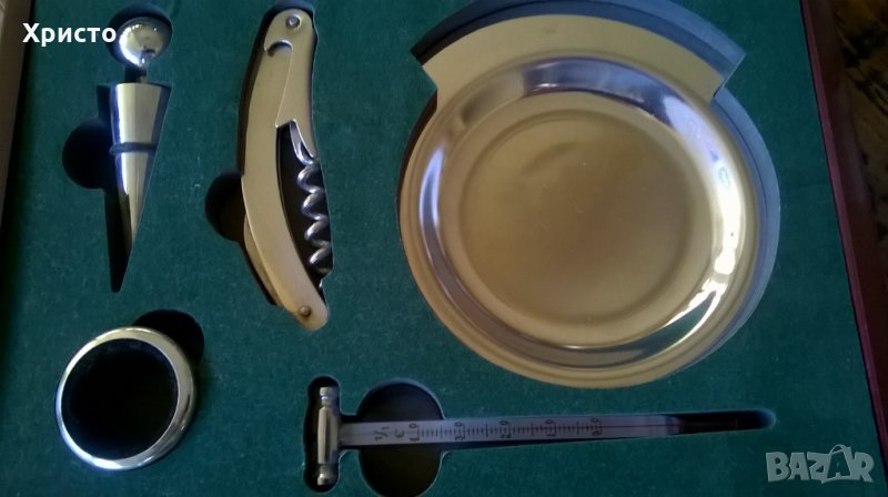 Продавам луксозна дървена нова кутия с аксесоари за вино - тирбушон,капко уловител,чинийка за тапа,термометър,запушалка.