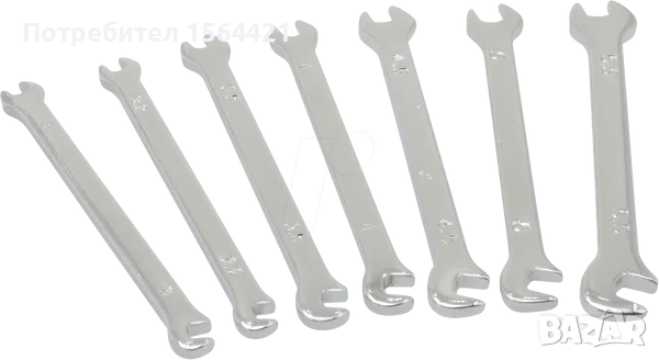 мини гаечни ключове 7 бр, DONAU-Германия, стоманени с дебелина 3 мм; Един и същ размер от всяка страна, различен наклон на челюстите от двете страни. Размерите са: 3 mm / 75 mm, 3.2 mm / 75 mm, 3.5 mm / 79 mm, 4 mm /79 mm, 4.5 mm /82 mm, 5 mm / 82 mm, 5.5 mm / 86 mm. Тегло: 0.1 кг