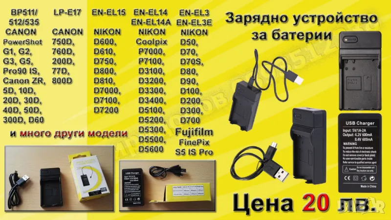 Зарядно устройство за батерии на Nikon, Canon и Fujifilm