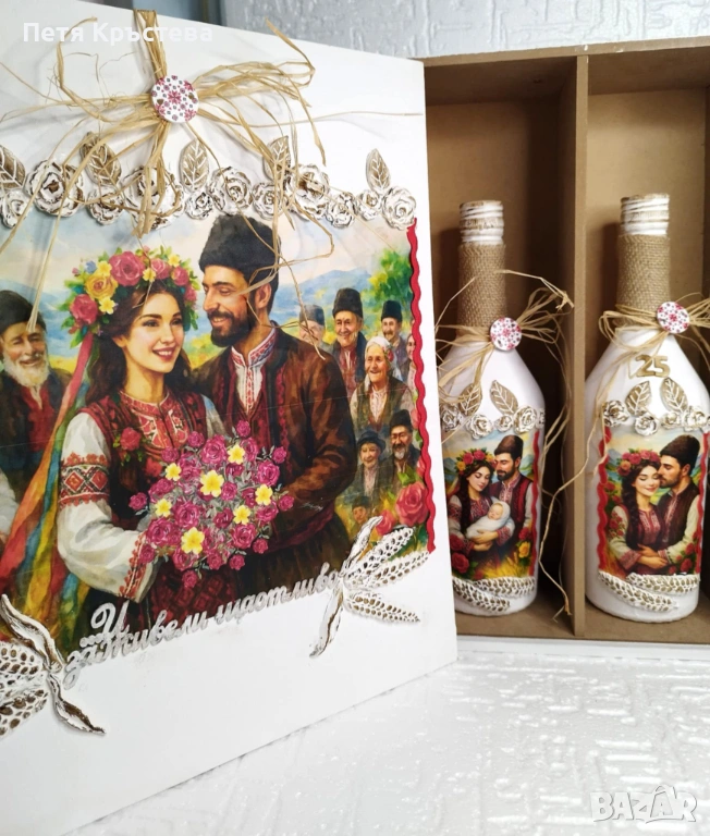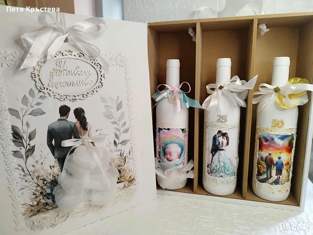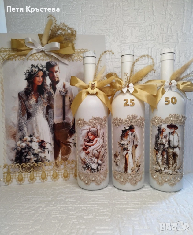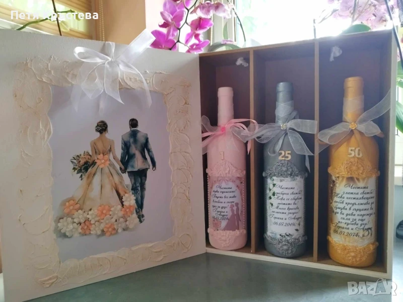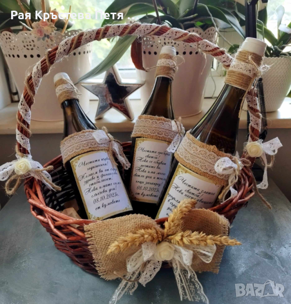 Тук може да откриете оригинален подарък за Вас или Ваш близък приятел.Нещата, които изработваме, могат да бъдат поръчани по всяко едно време. В повечето случаи, те ще бъдат направени специално за Вас и е необходимо да предвидите време за изработката им. Обикновено, срока за изпълнение е приблизително 1 седмица.Също така, всички продукти могат да бъдат изработени в различен цвят. Не се притеснявайте да попитате за възможните опции и промени, с удоволствие ще Ви помогнем да изберете подходящия за Вас вариант.Доставяме с Еконт чрез наложен платеж. Бутилки за наричане - първа годишнина, първа рожба, сребърна сватба, златна сватба.Бутилките може да бъдат поръчани по отделно или в украсена кутия или кошница.В зависимост от изработката и от броя поръчани бутилки цената търпи промени.