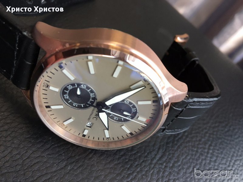 24 месеца гаранция,внос от Хонг Конг,прецизност при изработката.Достъпният лукс IWC TOP GUN, кварц, хронограф, полиран стоманен корпус "розово злато", сив циферблат с маркери и дата в позиция 3 часа, фосфоресциращи стрелки и черна кожена каишка с оригинално закопчаване.Каса 46 мм.,японски механизъм.