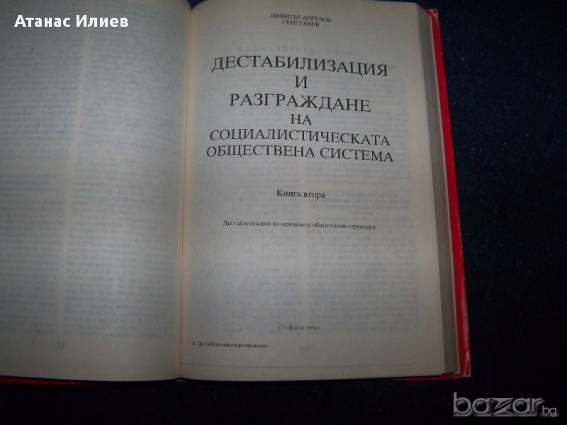 Изключително интересна книга, издадена в ограничен тираж "Дестабилизация и разграждане на социалистическата обществена система" от проф. Димитър Сепетлиев. Книгата е разделена на две части: "Книга първа - Прераждане на световната Руска империя в Социалистическа обществена система" ; "Книга втора - Дестабилизация на основните обществени структури". Книгата е с меки корици, 380 стр. в много-добро състояние. Издадена е през 1994г.
