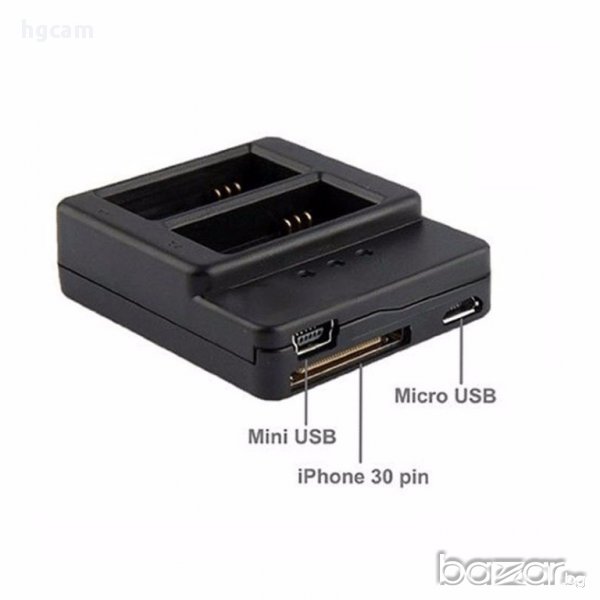 Това зарядно устройство ви дава възможност да зареждате едновременно 2бр. батерии(НЕ са включени в комплекта) за спортна видеокамера Hero 3/3+. Към зарядното НЕ е включен usb кабел или адаптер 220V за зареждане. Може да ползвате micro, mini usb кабел от комплекта на вашата камера или смартфон или 30 пинов кабел за Apple.