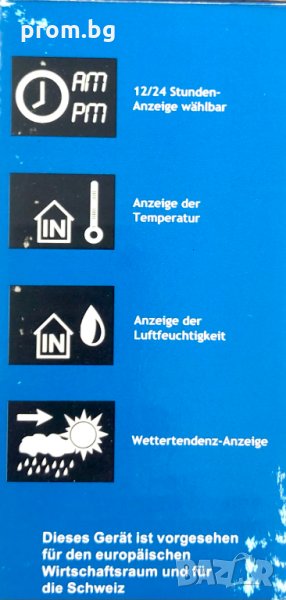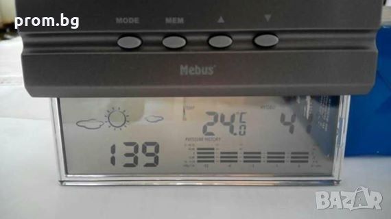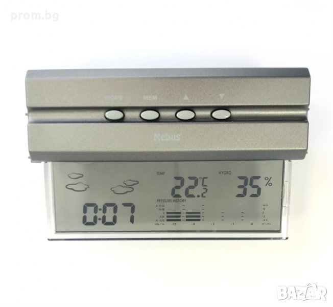влагомер, термометър и часовник, нов, немски, внос от Германия MEBUS, ползва се на открито и закрито, превключва между ° C и ° F, има памет за мин / макс. температура, влагомер, има памет за мин / макс памет за влажност, има функция Барометър, поддържа история /графична от последните 12 часа, кварцов часовник с 12 / 24h дисплей. Цвят: сребърен / прозрачен. Размери 7 х 11,8 х 3,5 см. Вкл.стойка за прикрепяне. Изпращаме с Еконт(10 % отстъпка от таксата) и Спиди.