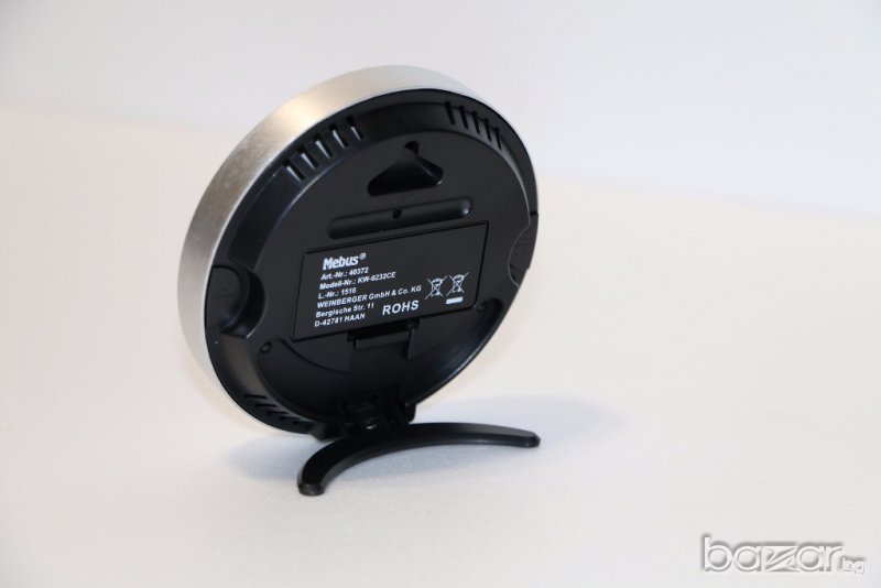 метеорологична станция, Германия, MEBUS. Превключва между ° C и ° F, има памет за максимална и минимална температура и влажност. Станцията е с висококачествена алуминиева рамка, използва се като настолна или за стенен монтаж. Размери: Ø 9,5 х 2 см, Цвят: сребърен.