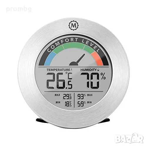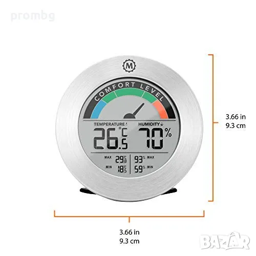 Измерим вътрешен температурен диапазон от -10°C (14°F) до +50°C (122°F). Диапазон на измерима влажност на закрито от 20% до 99%. Максимален и минимален запис за последните 24 часа както за температурата, така и за влажността. Лесен за четене индикатор за комфорт. С прибираща се стойка и отвор за монтиране на стена, този дигитален вътрешен термометър може лесно да бъде прикрепен към стената ви или поставен върху маса.