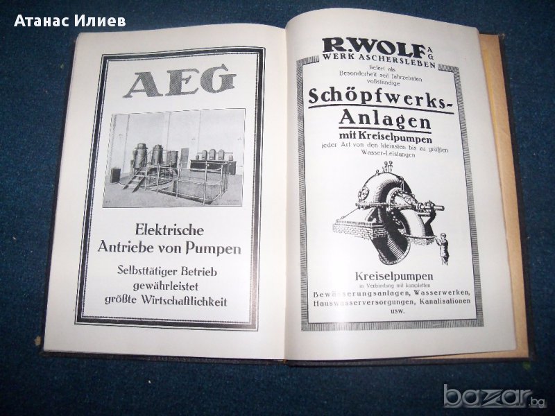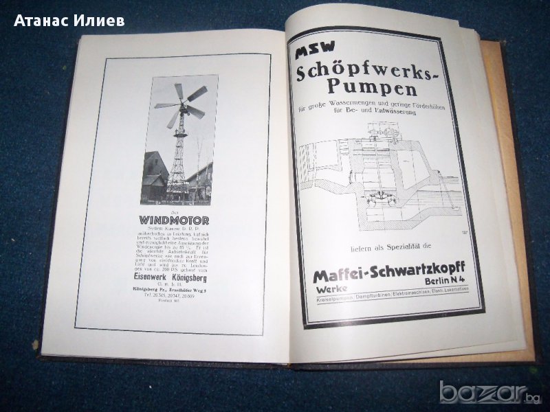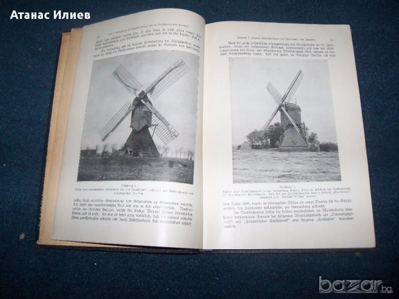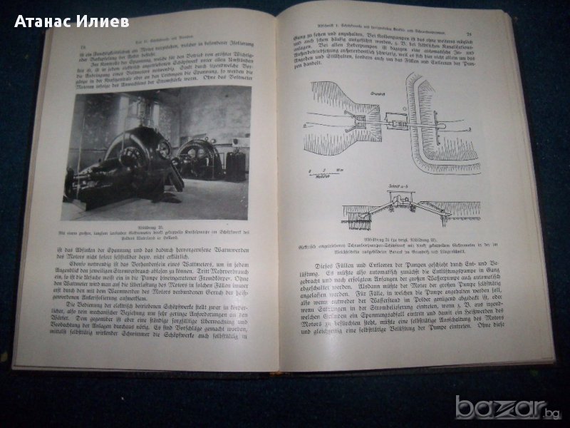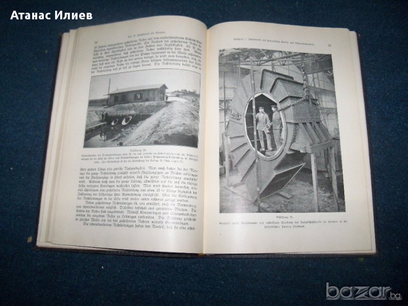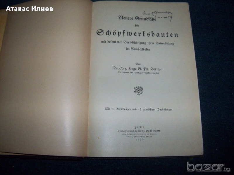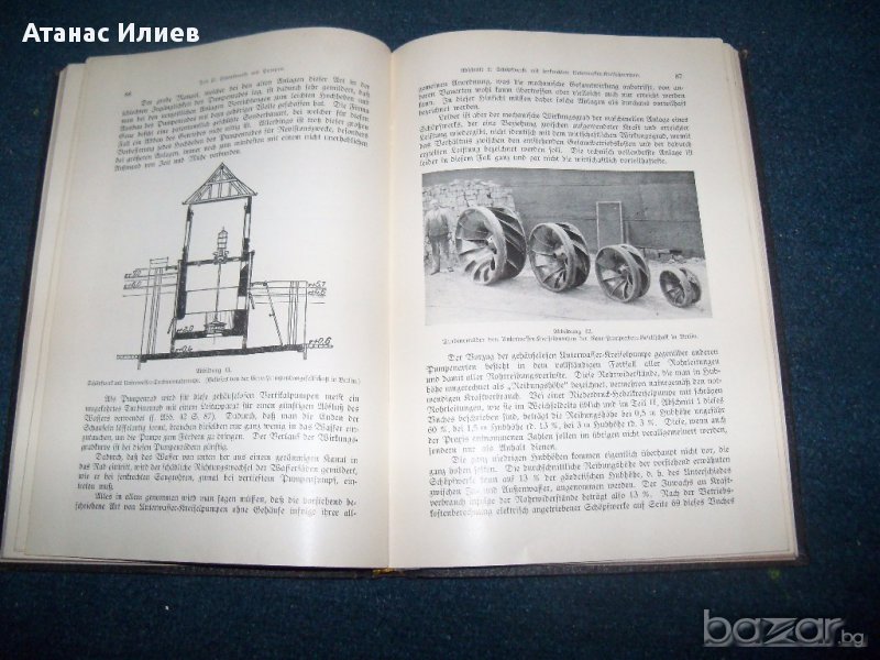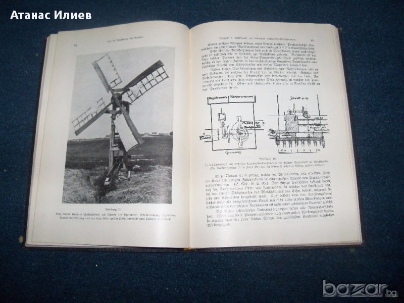 Neuere Grundsätze für Schöpfwerksbauten mit besonderer Berücksichtigung ihrer Entwickelung im Weichseldelta." - "Най-нови принципи за изграждане на помпени станции особено във връзка с тяхното развитие в делтата на река Висла." Книгата е с множество фотографии и чертежи. Автор Хюго Бертрам. Книгата е в отлично състояние, подвързана е с твърди корици, напечатана е с готически шрифт, издание 1925г. 158 стр. и седем листа реклами.