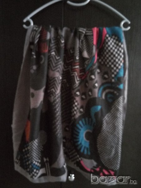 сн.2. Много голям шал в светло сиво с шарки в черно, цикламено, червено и синьо. Шарките са нещо като паунова опашка. Шала е много голям - дължина 186см, ширина 97см. Двата края са зашити, така е купен. 100% вискоза. Почти не е носен. Няма забележки. ЦЕНА - 9 лв.