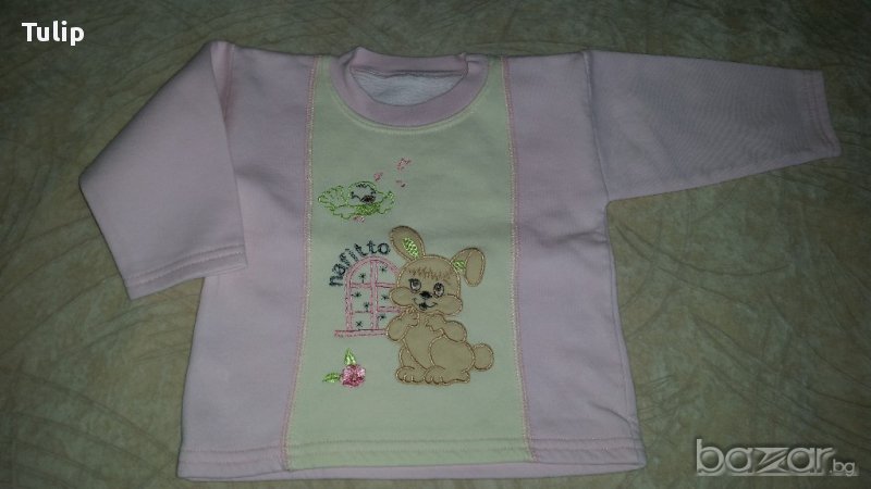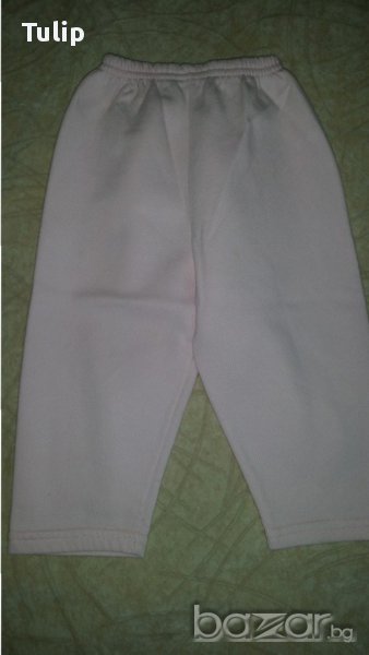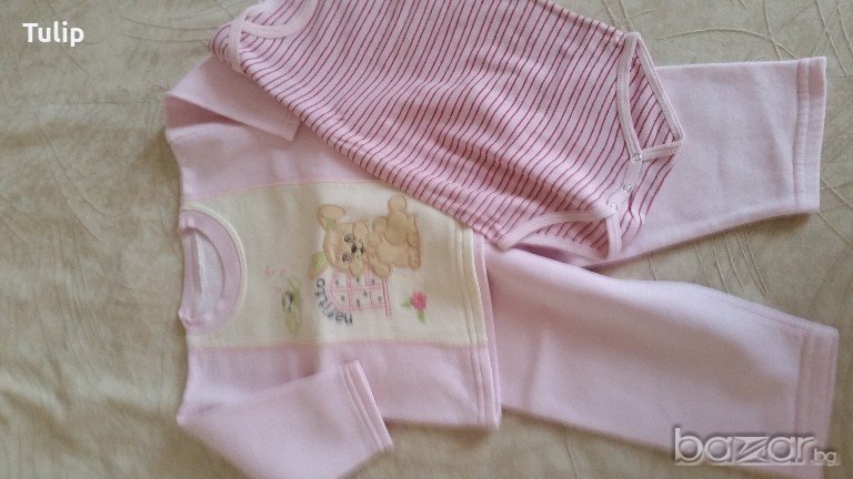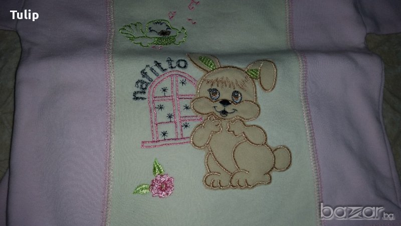 Сладко розово комплектче с лека вата, апликация зайче, подарък боди за същата възраст, дължина на панталона 46 см., от чатала 25 см., блузка дължина 33 сm., ръкав 23 см., разстояние от мишница до мишница 30 сm., запазенo в отлично състояние без забележки