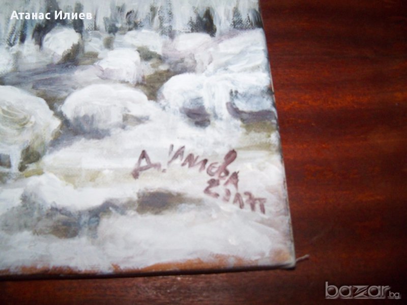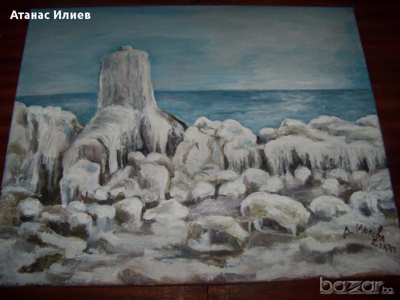 "Зимен бряг" картина на художничката Десислава Илиева, смесена техника, размери 40х50 см. Авторката е завършила специалност сценография, ученичка на известните видински художници Чавдар Петров и Цветан Тимотеев. Нейни картини са притежание на колекционери в страната и чужбина.