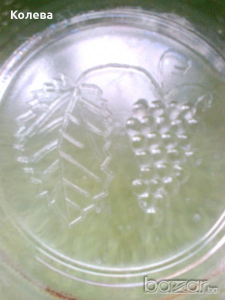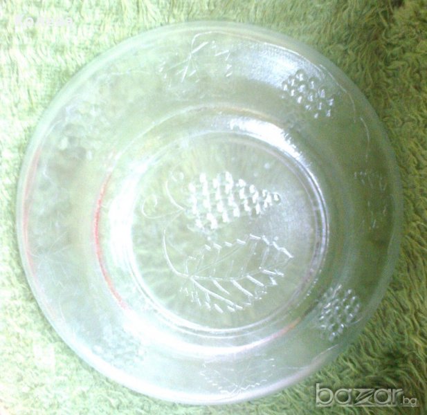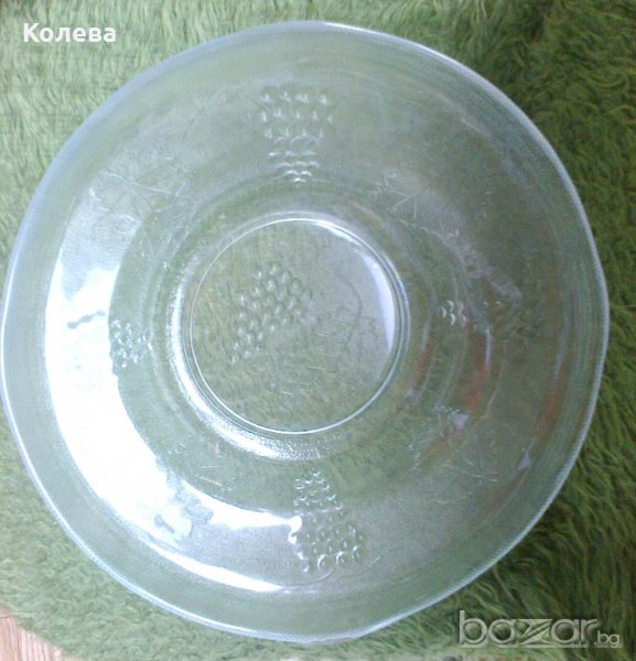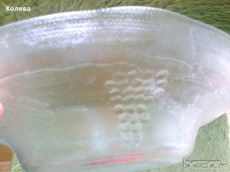 Фруктиера от прозрачно стъкло, в отлично състояние. Може някога да е била ползвана, но от 50 години - не е. Орнаментика - грозд с листо. 30 / 10 см дълбочина.