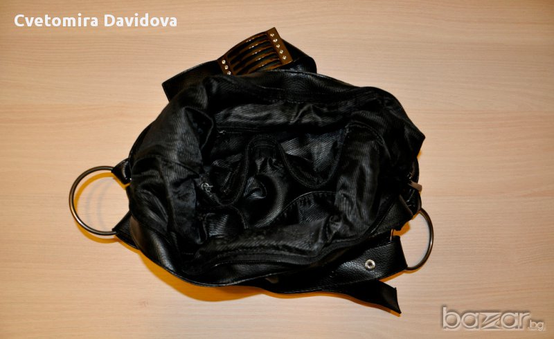 Вътре е с преграда-джоб, от едната страна има джобче с цип, а от другата два джоба за телефон. Отпред токата е декоративна. Отзад има джобче с цип. Чантата е без дъно. Параметри: дължина:27см./широчна:--см./дълбочна:20см. Забележка: Металните скоби на края на ципа му липсват. За това съм го прешила и останалата част от ципа попринцип влиза вътре в чантата и не се вижда. За повече информация ми пишете на лично.