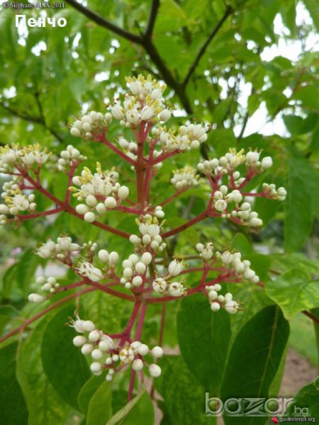 Цветовете й са бели, но към края на цъфтежа цялото съцветие придобива червен