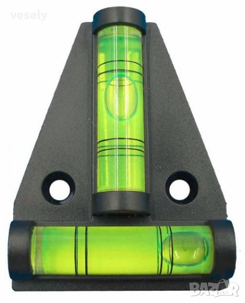 Миниатюрен триъгълен пласмасов нивелир T-тип с две либели за хоризонтална и вертикална повърхност. С отвори за монтаж. Размер : 58*44*13 мм