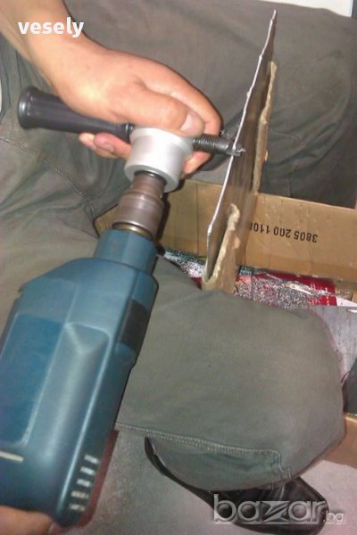 Приставката се затяга в патронника на стандартна бормашина превръщайки я в нов инструмент – щанцова ножица.Тя не реже ламарината на принципа на обикновените ножици с две