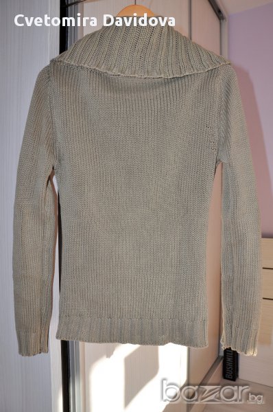 Пуловера е с голяма яка. Голямата яка позволява да се носи и с едно голо рамо. Много запазен пуловер.