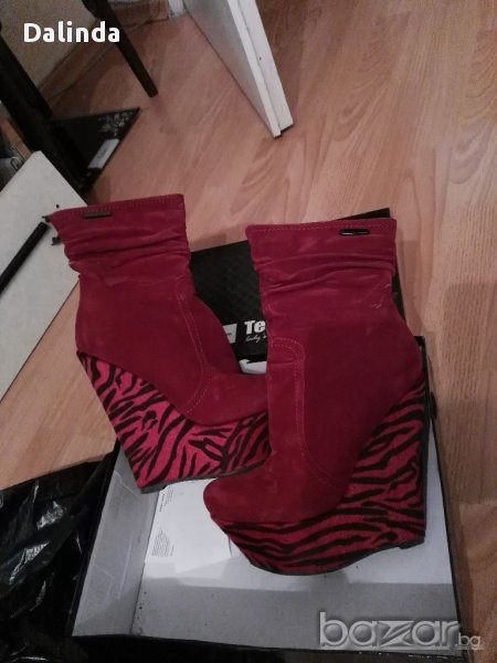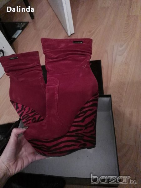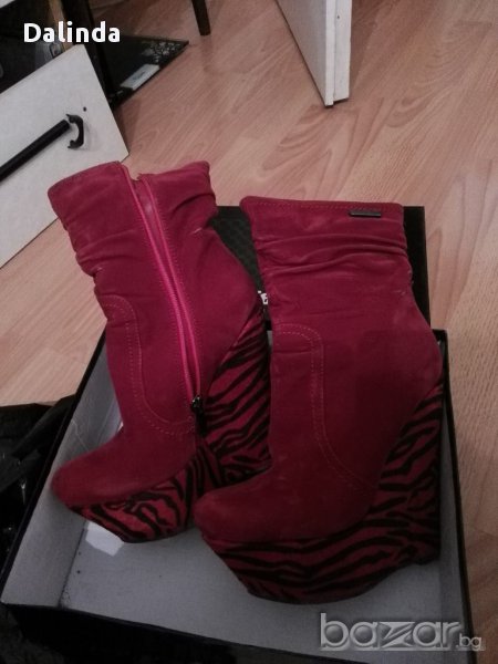 Елегантни велурени боти на платформи в цвят бордо. Въпреки че са доста високи са много удобни заради платформите. Обувани са два пъти и така си стоят в гардероба.