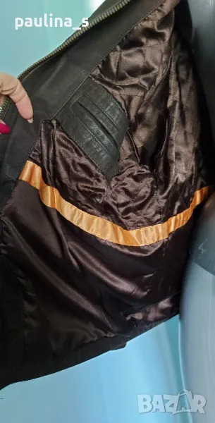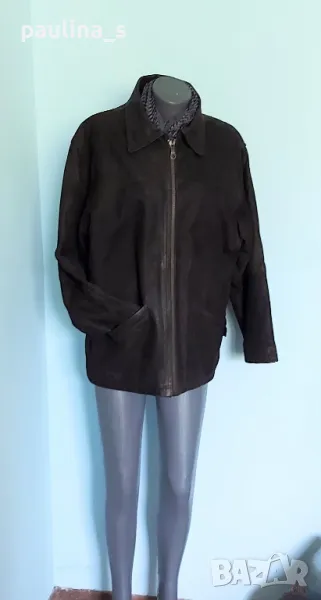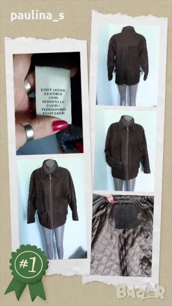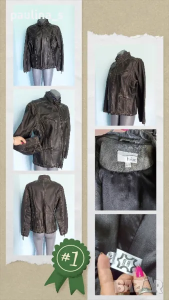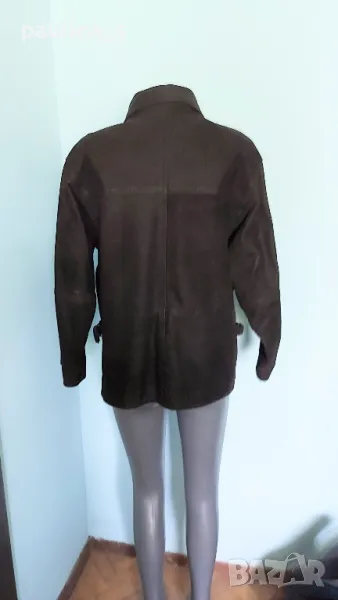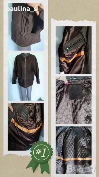 1️⃣. Колаж / XL / 2XL " Bright". Цената е крайна 64,99лв / 30 евро. Унисекс яке от естествен набук. Цвятът е тъмно кафяво до черно. Кожата е много дебела и здрава, дрехата е топла и тежка. Има капитониран хастар с вата, става и за зимата. Моделът е прав с падащи рамене, без вталяване с коси лицеви джобове, и два вътрешни. Вталяването става с ленти и токи, симетрично в страничните платки на дрехата. Без дефекти по кожата и хастара.