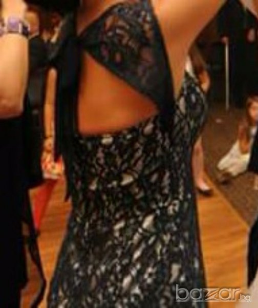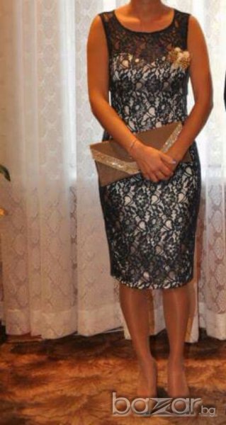 Страхотна тъмно синя дантелена рокля.Роклята е с бяла подплата,която се вижда.Гърба е отворен,има панделка.Купена е за 120лв,носена е веднъж