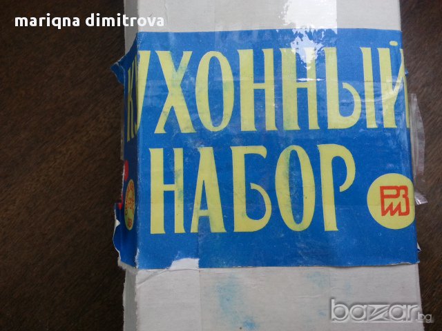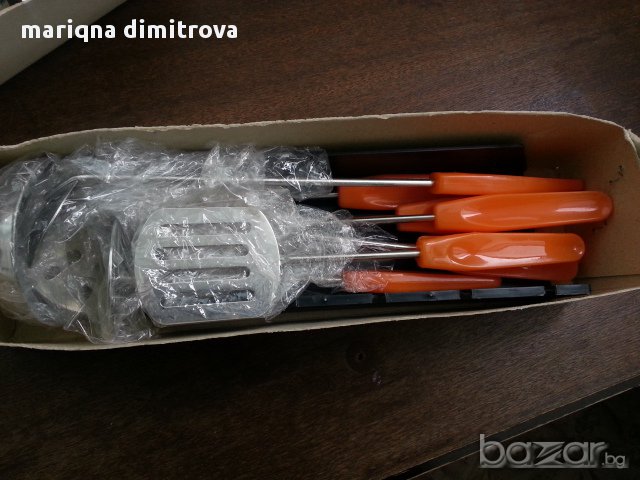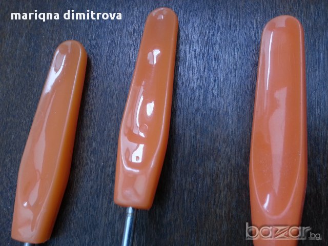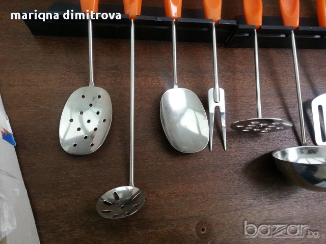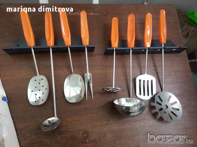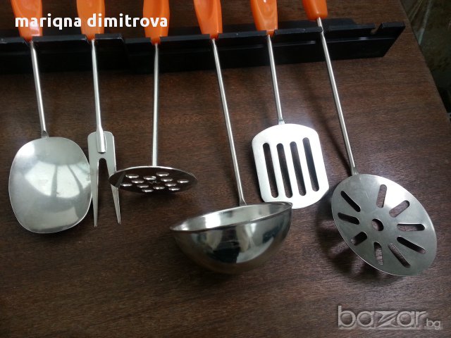 кухненски набор прибори за готвене сервиране неръждаеми нов в кутия руски съветски ссср с оранжеви дръжки и две черни стойки за стена комплект сет лот ретро арт декор винтидж колекция старинни антикварни предмети обзавеждане за дома и семейството подходящи за подарък за ценители и колекционери