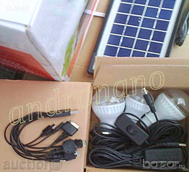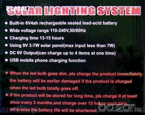 - Лампите се захранват от акумулатор , който се зарежда от 220V или от слънчева батерия. Устройството може да зарежда и всякакви видове GSM устройства.