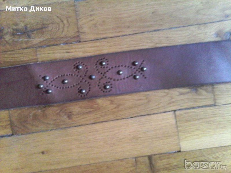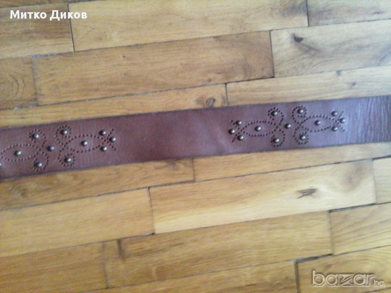 Колана е от естествана кожа -в много добро състояние-размери- на 101см-става и за мъж и за жена-по средата на три места има вградени метални топчета за украса-изпращам по еконт с отстъпка