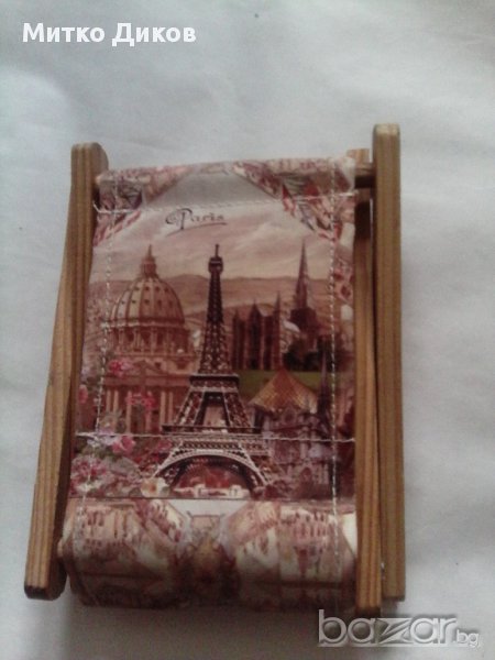 конструкцията е дървена а облицовката е от импрегниран плат изабразяващ гледки от Париж-Айфеловата кула и в дъното разни други забележителности-размер като цяло 16см на9см на3см и на вътрешноста за поставяне на разни джаджи7см на 5см--изпращам по еконт с отстъпка