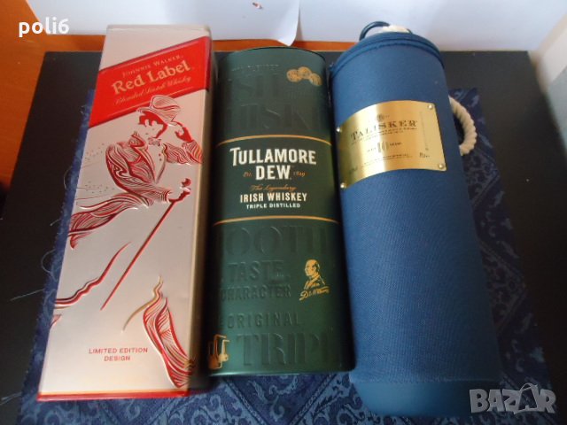 снимка№2 метална кутия Johnnie Walker размер 29.6/8.5/8.5см цена 2€,метална кутия Tullamore DEW размер 27/10/7,8см цена 2€,кутия от плат Talisker- може да се ползва като термо кутия размер 31см,диаметър 10см ,вътрешен диаметър 8,5см цена 2€///