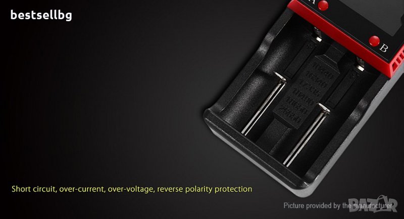 Устройство дава възможност за зареждане 1 или 2 батерии едновременно, всяка от която се зарежда независимо с отделен слот на LCD дисплея.