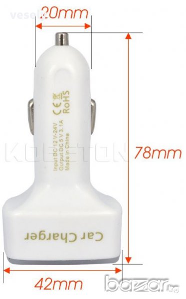 1.USB Зарядно Монитор 4 в 1 за кола - 18 лв Включен в запалката на колата, мониторът измерва напрежението в V, тока на натоварване в A и температурата в колата в С. Освен това има 2 USB/2.1A/1A изходa за зареждане на смартфон или таблет. Оптимизиран за iPad,за iPhone и за iPod бързо зареждане (2.1А за iPad,1А за iPhone/iPod). Със защита срещу прегряване, късо съединение и токов удар. Съвместимост със всички смартфони, таблетии мобилни устройства с USB порт. Input: DC 12-24V. Диапазон на измерваното напрежение от 5 до 25 V с точност 0.2V; Output: DC 5V/3.1A (2.1A/1A)- Диапазон на измервания ток от 0.1А до 3.1А с точност 0.1A. Диапазон на измерваната температура от -20 до +80 С с грешка 1С. Модулът е с ефективност на преобразуването 95%. Сертификати: RoHS 2. Термометър-