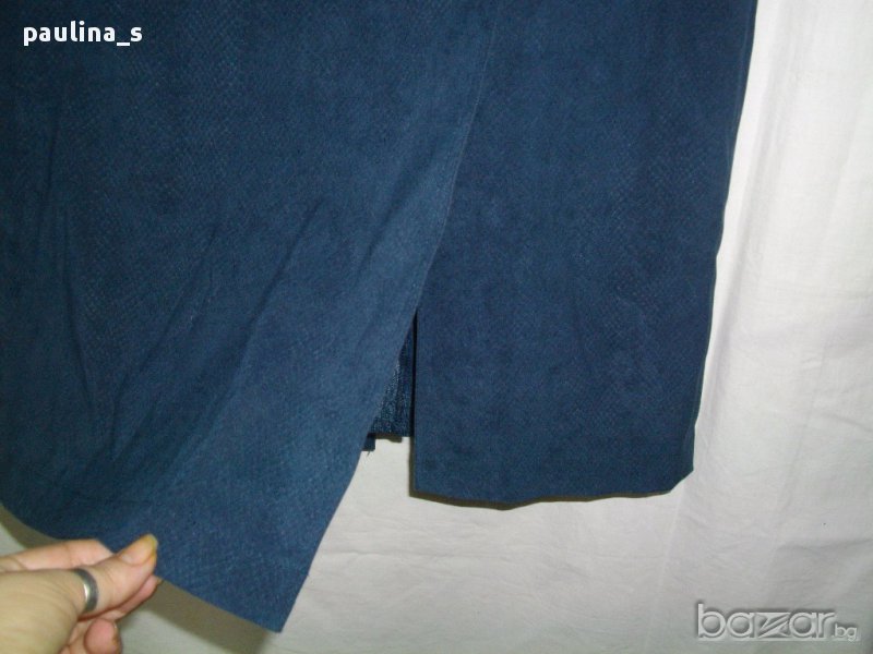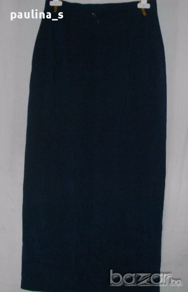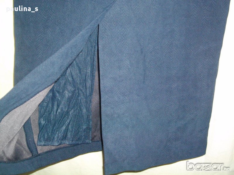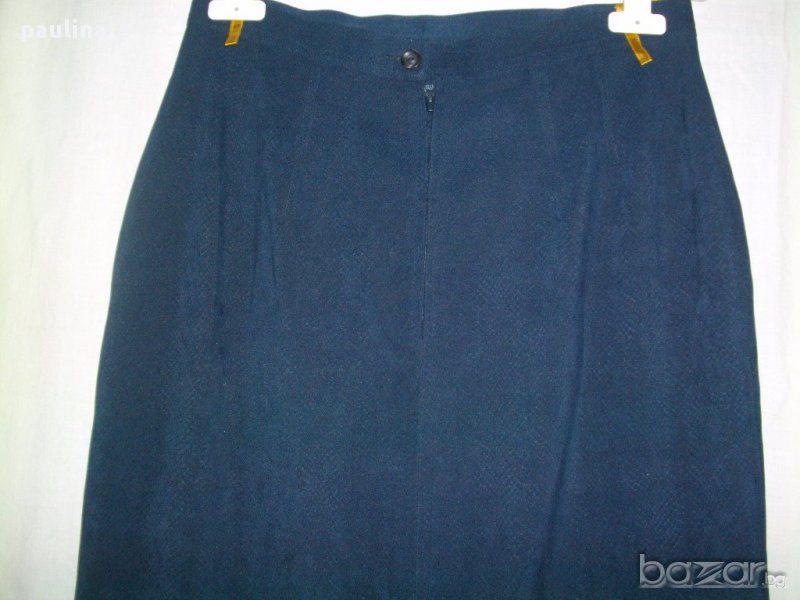 Луксозна дълга пола с цепки и хастар. Цвят "Navy Blue"- "snake print". Материята е ацетатна коприна и 5%еластан, стои релефно и много изискано, немачкаема. Модел с висока талия, асиметрична дълбока цепка отпред, дълбока прихлупена цепка отзад. Невероятно качествена изработка.