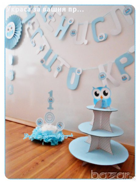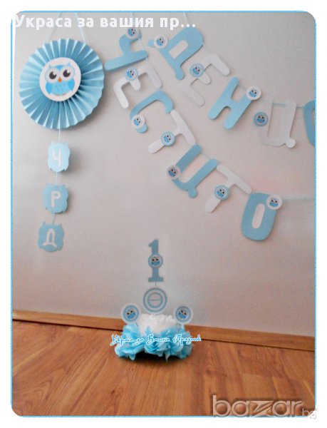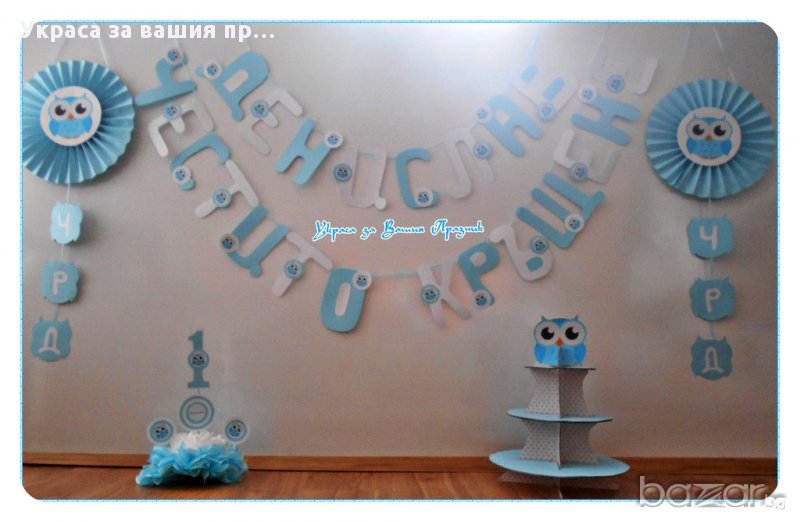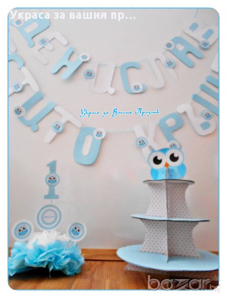 Украса и надпис за двоен празник рожден ден и кръщене с Бухалче
