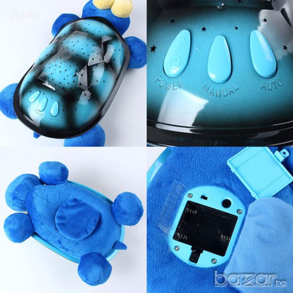 Музикалната костенурка има специални отвори в корубата, които светят и прожектират по стените и тавана на стаята безброй звезди и луна в сапфирено син, изумрудено зелен, рубинено червен и мек кехлибарен цвят - можете да избирате дали да се редуват плавно цветовете, дали да свети само един или всички заедно. Създава вълшебна атмосфера за лека нощ и помага на детето да заспи бързо и спокойно. Характеристики: При работа черупката на костенурката може да свети в 4 цвята - син, зелен, червен и жълт, като комбинацията между цветовете и режимите на работа създават 7 различни съзвездия. Играчката има вградени 4 мелодии. Режими на работа: Автоматична смяна на цвета през определен интервал Всички цветове едновременно и комбинации между основните цветове. Звука може да се пуска и спира независимо от светлината.