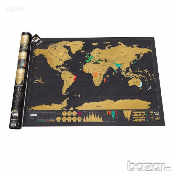 Тази креативна географска карта е покрита със златисто фолио, което придобива различни нюанси и прекрасни цветове след изтриването на избраното място. Скреч картата е и една практична, интересна и забавна комбинация за запаметяването на вашите незабравими и вълнуващи пътеществия, която ще остави незабравим спомен у Вас - винаги, когато погледнете изтритото място ще се сещате за вашите вълнуващи преживявания от там.