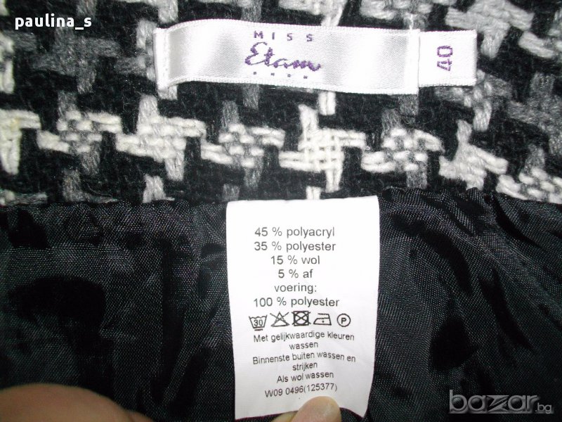 1️⃣. L / XL "Miss Etam". Цената е крайна, без пазарлъци 29,99лв / 15 евро. Брандова пола с хастар. Моделът е с платка, от която започват джобовете, без дефекти и етикет, нова е. Плохата е двойна(още с фабричната фиксация) и започва от нивото под ханша. Закопчаване отзад с цип. Качеството на изработка е гарантирано от бранда.