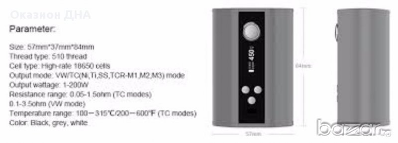 10 ТЕЧНОСТИ ПОДАРЪК ДЕКАНГ 18 ИЛИ 24 МГ. !!! 100% Оригинал! Цвят,сив и черен,страхотен мод работещ с 3 батерии 18650,и термоконтрол.Пълни комплекти,кутия,книжки,заряден кабел.Има стреч код,за проверка в сайта на производителя,за автентичност.Просто ми идва голям и тежък...за това се продава.Разполагам и с чисто нови батерии СониVTC5,на цена 20лв брой.Бартер за двубатериен нов мод.