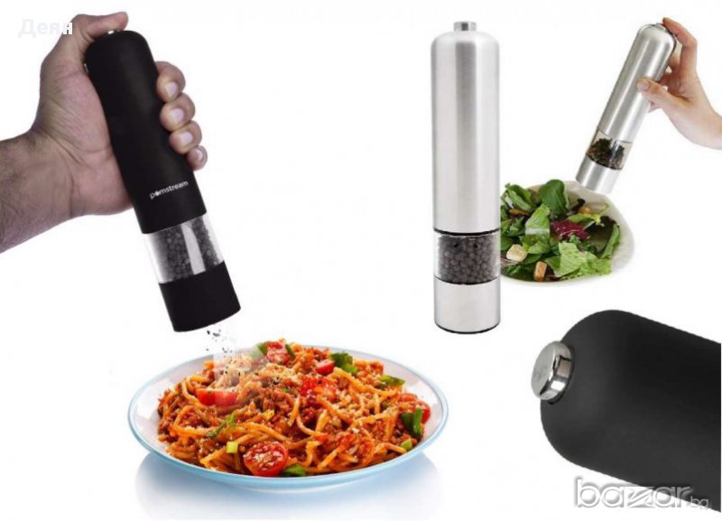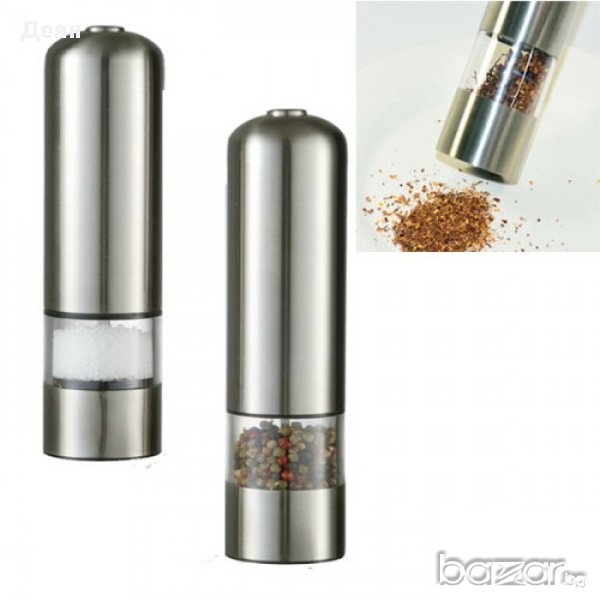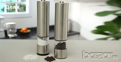Модерното готвене у дома! Иновациите винаги са на мода!Овкусявай всяко ястие без никакво усилие с помощта на Електрическа Мелничка за Пипер или Сол на Батерии!Само натиснете отгоре и нужното количесво от любимата Ви подправка ще бъде осигурено. LED подсветка за по- ясна видимост какво количество да използвате. Невъзможно е да не я пожелаете! Изключителен дизайн от стомана и стъкло, подходяща и за най- капризните домакини!Електрическата мелничка може да се използва и за други подправки.Предимства:Електрическа мелничка за пипер или сол от неръждаема стомана.Висококачествена керамична глава.Лед подсветка.Лесна употреба.Стилен дизайн.Здрава изработка.Захранване: 4 x AA батерии (не са включени в офертата).Размери: 23 х 5,5см.