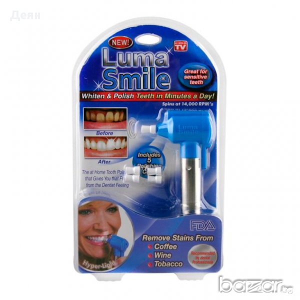 Luma Smile е полираща система за премахване на петна от зъбите в домашни условия, с дълготрайни резултати.Усмихвайте се без притеснения, като се възползвате от лесната и безопасна употреба на уреда.Подходяща и за чувствителни зъби. Работи с две батерии АА.Комплектът включва: уред за избелване на зъбите накрайник за избелване на зъбите 5 бр.Начин на употреба:Всеки от накрайниците е подходящ за многократна употреба. Можете да използвате уреда със или без паста за зъби.При използването на паста за зъби, трябва да нанесете малко количество от пастата върху мястото, което ще бъде третирано.Полирането не трябва да бъде повече от 10-15 сек. на зъб, след което изплакнете.За по-добри резултати изполвайте Luma Smile един път седмично.