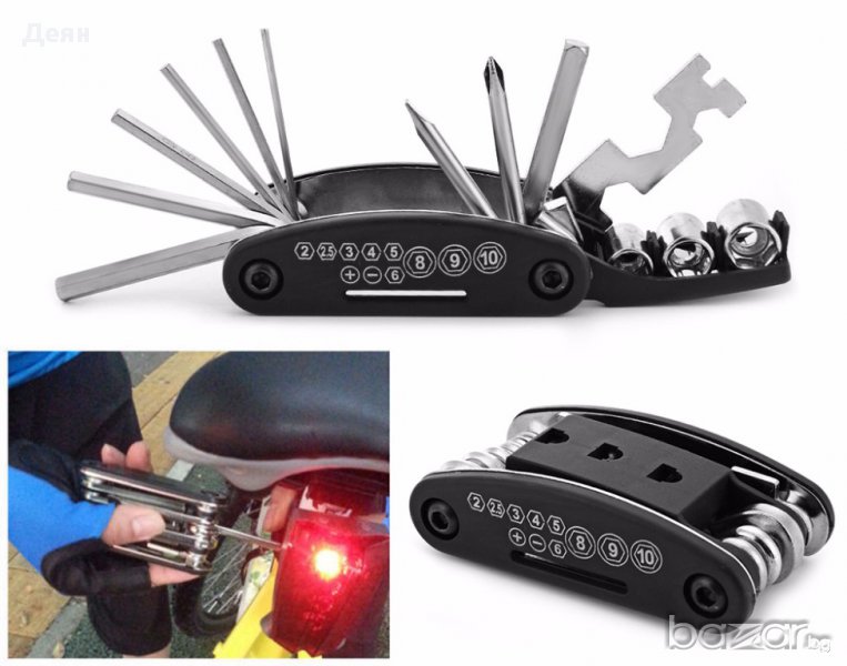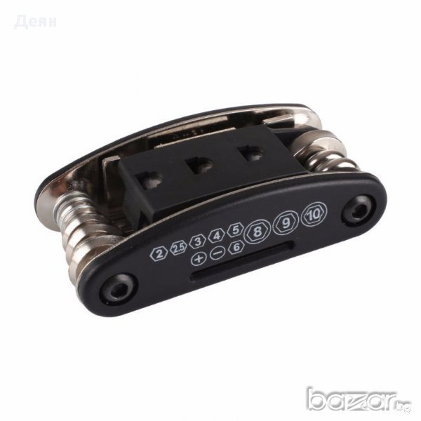 Комплектът включва: Шестограми:2 , 2,5 , 3 , 4 , 5 , 6 ммШестограми патрон гидоре: 8 , 9 , 10 ммГаечен ключ: 8 , 10 , 15 ммКлюч за спици : 1 бр Плоска отверка : 1 брКръстата отверка : 1 брНакрайник за шестограми : 1 брРазмери : 8,65х4,7х2,55 смТегло : 262 гр