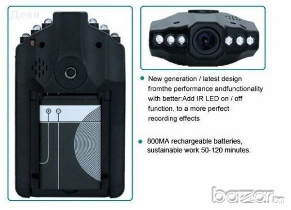 DVR устройството може да бъде инсталирано на предното стъкло на колата, за да записва видео, аудио данни, свързани с превозното средство, удар или аварии. Този запис от устройство се съхранява в картата с памет и може да бъде анализиран, за да ви помогне да определите какво се е случило с превозното средство преди, по време и след катастрофата или събитие. Притежава и нощен режим за видео запис. Това устройство е подобно на "черната кутия" на самолетите.Описание:LCD екран с диагонал 2.5 инча, който може да се завърта на 270 градусаЗавъртане на обектива на 180 градусаЗаснемане на картина - 140 градуса, т.е. пълно покритие на пътната лента и странитеСветодиодно осветление се включва автоматично, осигурявайки видеозапис в тъмнотоАвтоматичен запис, когато бъде пуснато захранванеВидео запис по време на зарежданеЦиклична запис, първо са заменя най-старите видео записиУдобно и лесно управление на DVR устройствотоМаксималната разделителна способност видео с висока резолюция 1280×960, 30 fps (интерполирано)Автоматично добавяне на дата и час на видеоМаксималното поддържа 32 GB SD картаТехнически характеристики:Обектив: 140 ° широкоъгъленТип на сензор: 1/4 CMOSВидеозапис: QVGA (30fps), VGA (30fps)Екран: 2,0-инчов LTPS цветен LCD завъртящ се на 270 °Звукозаписи: двуканален стереоВидео формат: AVIФункция за защита от вибрации, когато се снима: EISПодсветка на LED : имаАкумулаторна батерия: имаТип на батарея: 3.7V Работи с презареждаема батерия за Нокиа, която е включена в комплекта! (модела на батерията е BL-5C 1200mAh, 3.7V 3.8Wh) Капацитет на батерията: 1200 mAhDC input: 5V 500mAUSB интерфейс: има Размери: 96 (L) x53 (W) x23 (H) мм Пакета включва:1х Видеорекордер за кола1х Вакум стойка1х Батерия BL-5C 1200 mAh1x USB кабел1х Зарядно за запалка