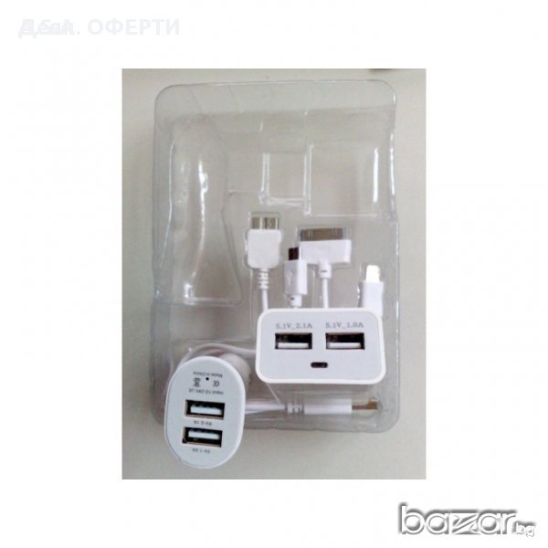 3 в 1 Универсално зарядно за телефони и таблети с 2бр. USB 2.1A и 1.0A. Модела е подходящ за зареждане на iPad2/3/4 ; Mini ; Air ; iPhone 4/4S/5G/5C/5S ; P1000 ; V8 ; Note 3 както и за всички смартфони и таблети с MICRO USBКомплекта включва:-Зарядно за 220V с 2бр. USB порта 5.1V 2.1A и 5.1V 1.0A-Зарядно за кола с 2бр. USB порта 5.1V 2.1A и 5.1V 1.0A-USB кабел с 4бр. накрайника: micro USB ; micro USB с дата, зарядно за Iphone 4/4S ; Зарядно за Iphone 5/5S