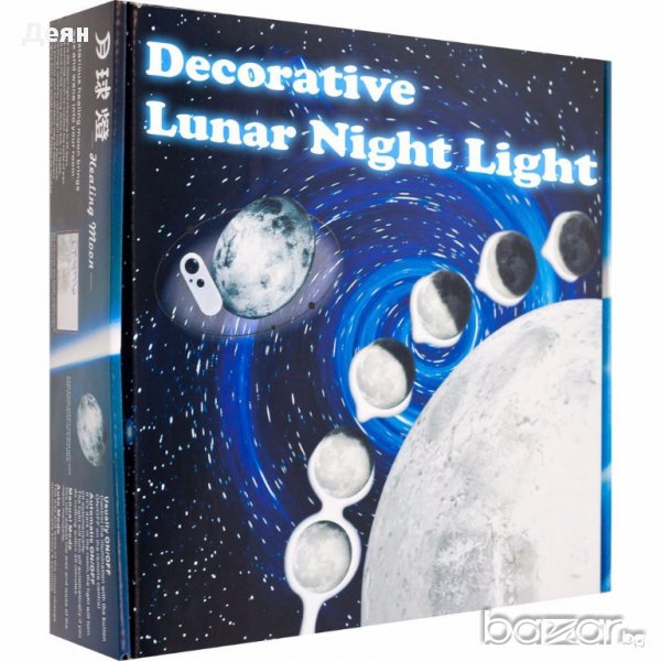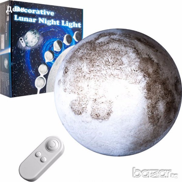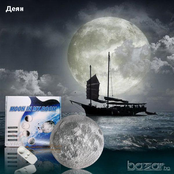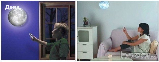 лампа Луна с дистанционноТова е една красива, стенна, нощна лампа, наподобяваща Луната изключително реално и точно. Досущ като истинска, тя може да свети в няколко фази: пълна луна, полумесец или лунен сърп. Тя е и със специфичния релеф, който е характерен за нея. Тази лампа има автоматичен и ръчен режим. Когато е в автоматичен режим, светлината на лампата се променя на всеки 5 секунди, а при ръчния режим сами избирате в коя фаза на Луната да оставите лампата. Когато в стаята е тъмно, лампата ще се включи автоматично. Има и автоматично изключване след 45 минути, само когато лампата е в автоматичен режим. Тази лампа е с дистанционно управление и с него можете да избирате мемжду двата режима на работа. Неговият обхват е около 4 метра. Тази лампа работи с 4 бр. АА батерии, които не са включени, а дистанционното с 2 бр. ААА батерии, които също не са включени. Тя е изработена от ABS пластмаса и е с размери: 25 х 25 х 7 см. Комплектът се състои от: 1бр. стенна лампа Луна и 1бр. дистанционно управление.