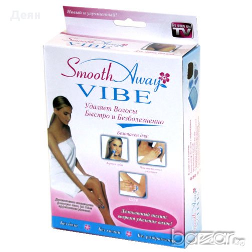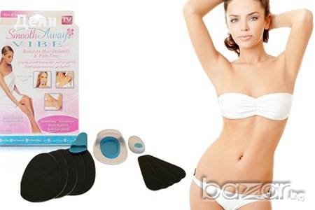 Система за епилация, с която повече няма да ви се налага да се бръснете! Със Smooth Away Vibe винаги ще имате гладка и нежна кожа при това напълно безболезнено и безопасно!Край на порязванията, вредните химикали и болезненото скубане!Може да се ползва за крака, ръце, лице, бикини зоната, корема и подмишниците.Подходящ както за жени така и за мъже, за почти всеки тип кожа.Премахнете нежеланото окосмяване безболезнено и лесно. Можете да го използвате всеки ден.Комплекта включва:1бр. Голяма подложка1бр. Малка подложка1бр. Вибро пуслсираща машинка за още по-бързо обезкосмяване4бр. Самозалепващи се пластири за голямата подложка4бр. Самозаляпващи се пластири за малката подложкаИнструкции за ползване:ВНИМАНИЕ! Ползвайте го върху чиста и подсушена кожа като използвате леки движения по посока на часовниковата стрелка и обратно.